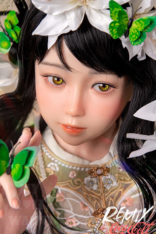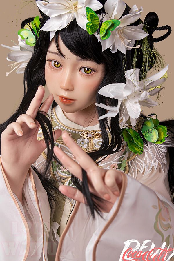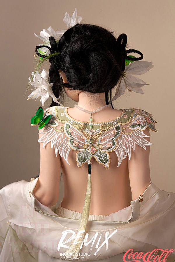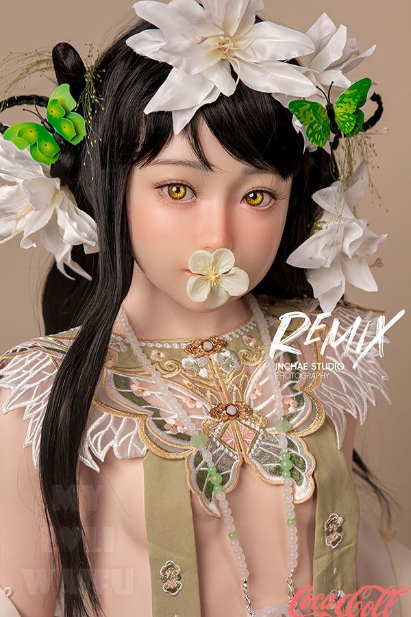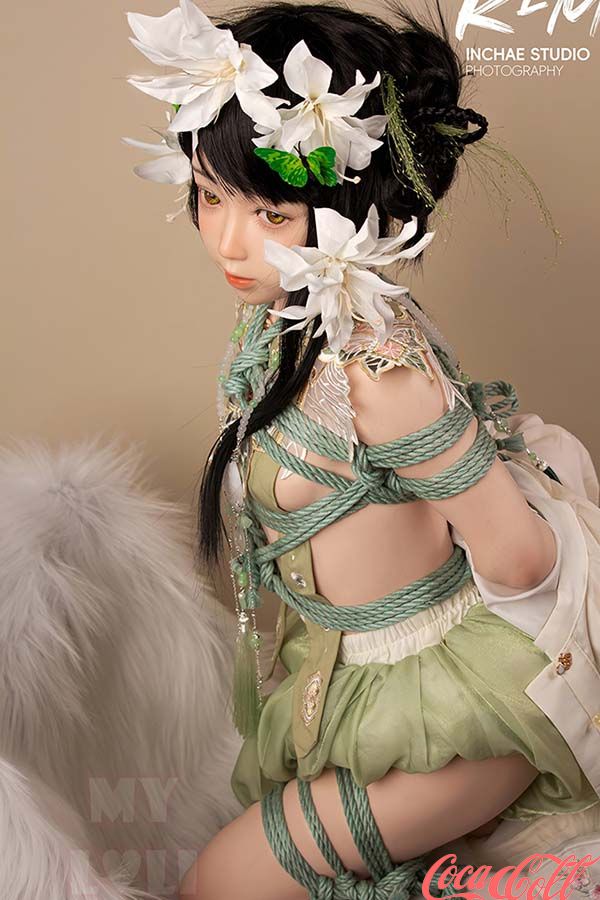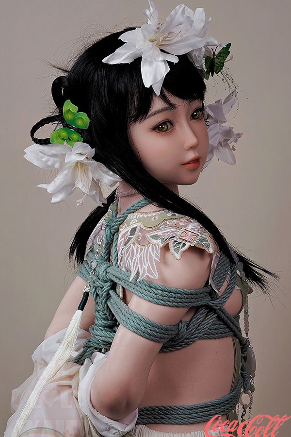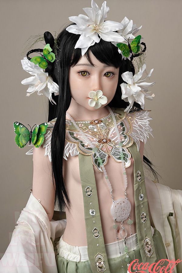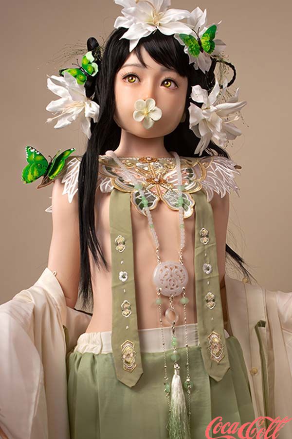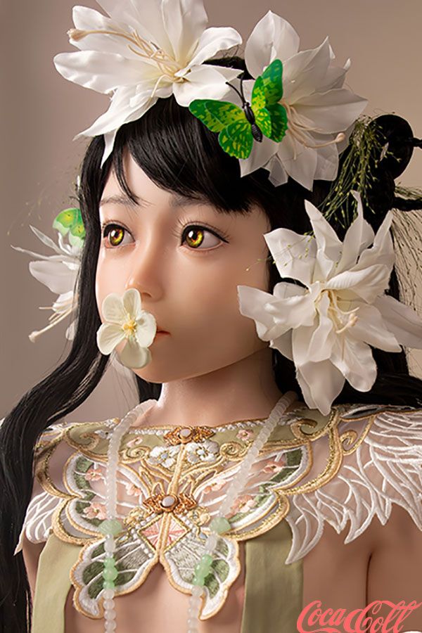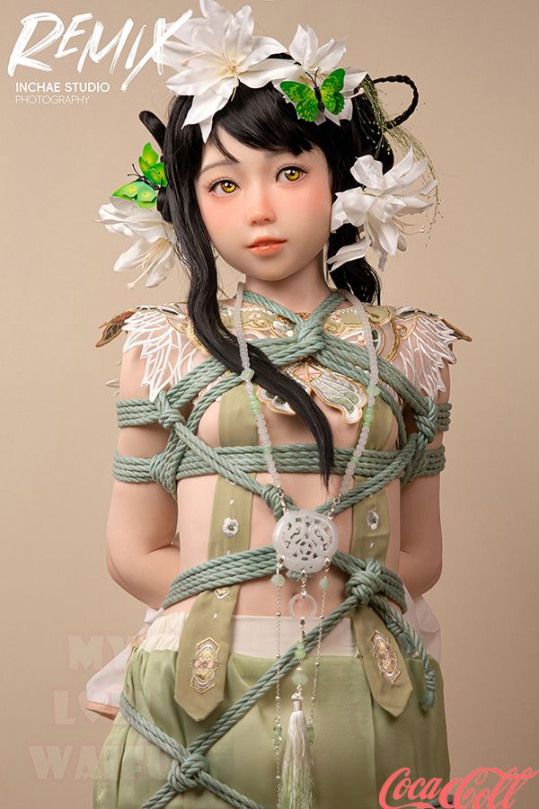 With her long silky black hair crowned by white flowers and green butterflies, glowing golden eyes, delicate features, and that gentle, innocent expression, AYA appears as a mystical forest spirit brought to life. Standing at 127cm with slender A-cup proportions, this small sex doll is wrapped in artistic green rope harnesses, golden armor accents, and flowing fabrics that accentuate her soft, supple silicone skin.
