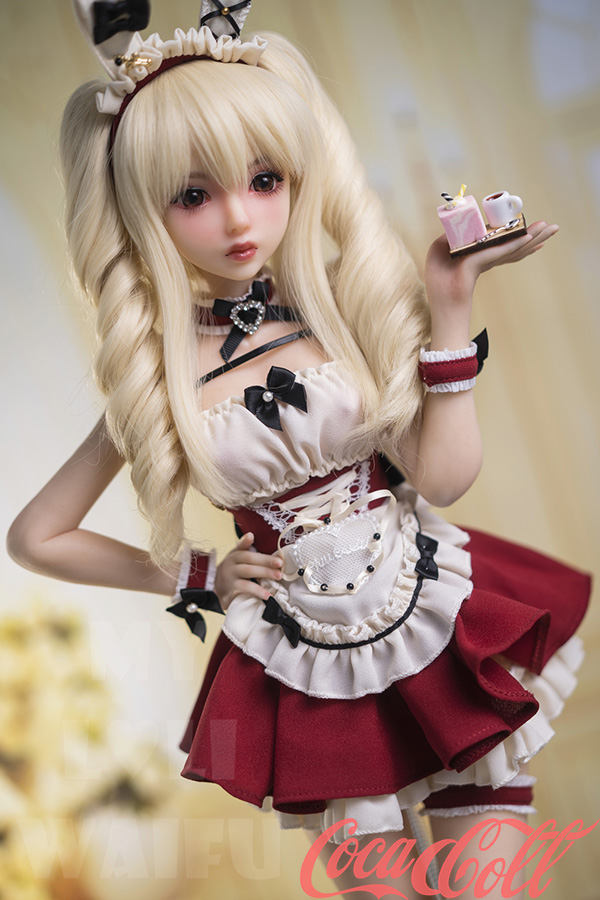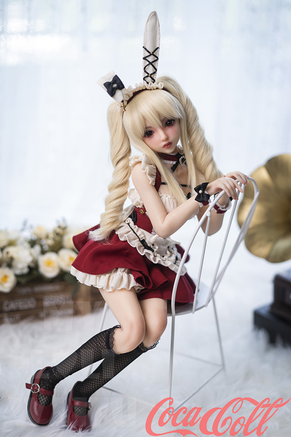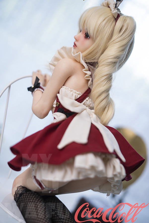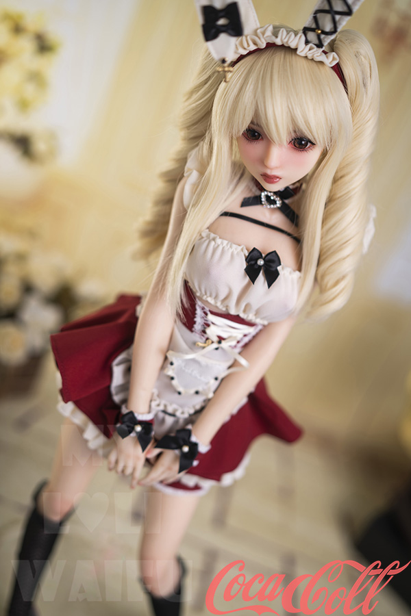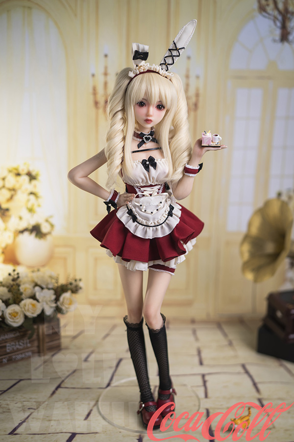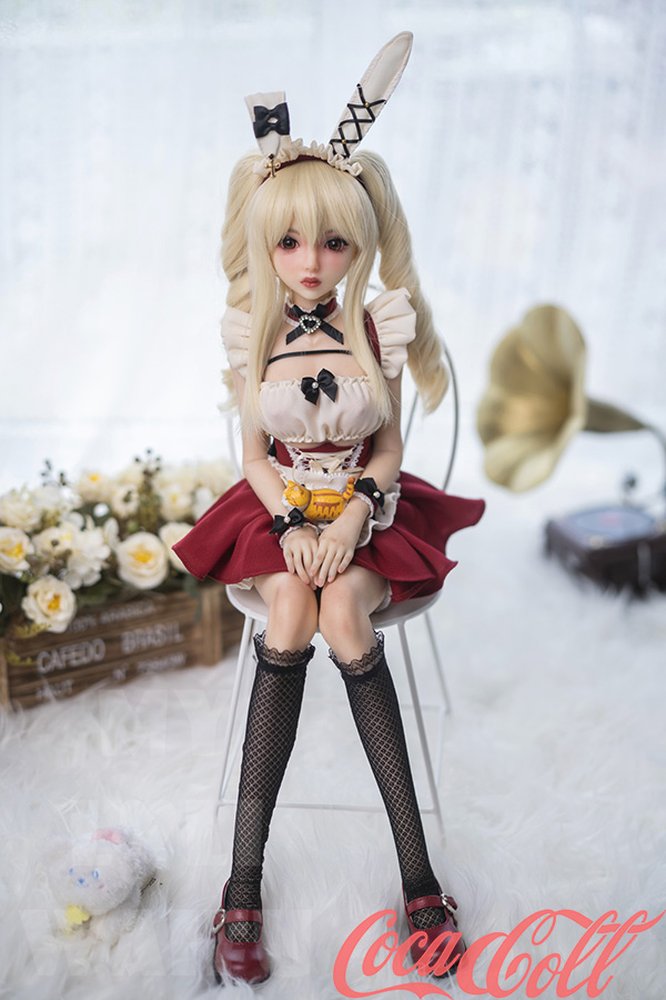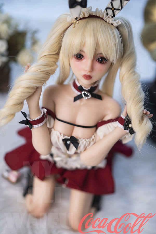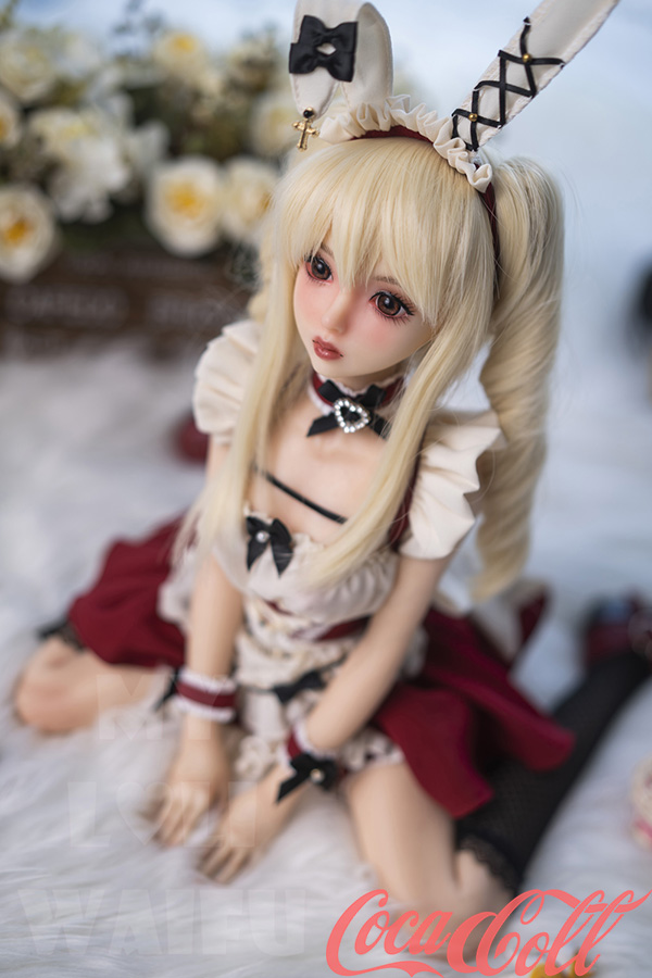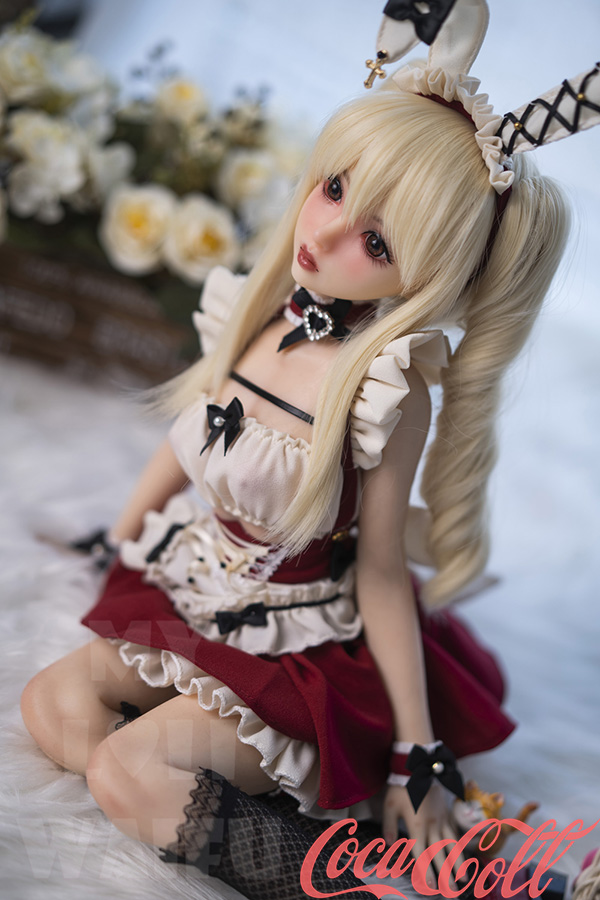 With her long blonde twin ponytails, huge sparkling red eyes, sweet pouty lips, and playful bunny ears headband, Lumi hops straight from an anime dream world. At just 60cm with petite A-cup proportions, this mini sex doll wears a cute red-white frilly bunny maid outfit with bows, ruffles, choker, and cuffs that highlight her soft, lightweight silicone body.