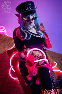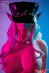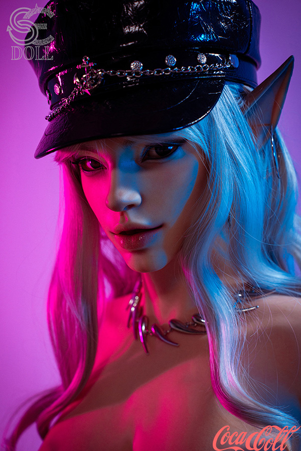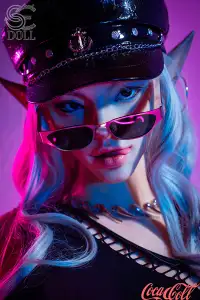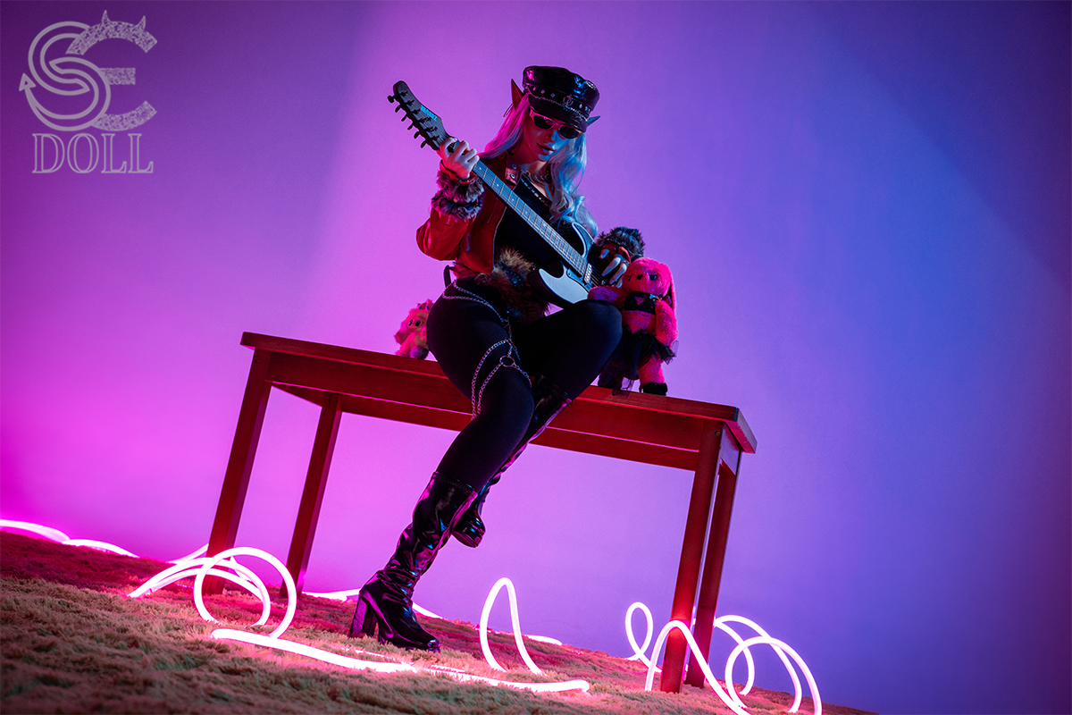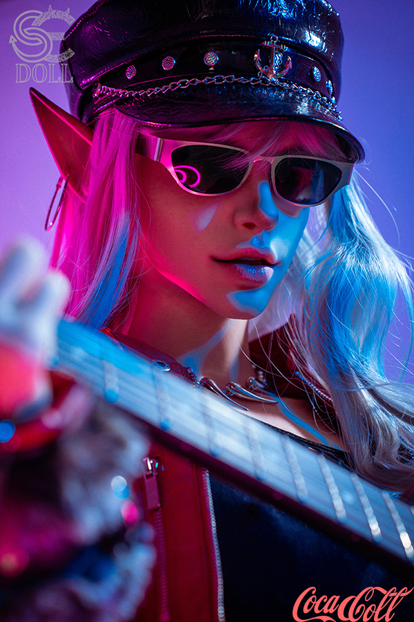 With her pointed elf ears, glowing silver-blue hair, cool sunglasses, and that fierce rockstar attitude, Evadora.B looks like she emerged from a neon-lit fantasy world. Standing at 165cm tall with perky C-cup assets, this elf sex doll rocks a punk ensemble of red leather, fur cuffs, chains, and a guitar in hand, surrounded by playful monster plushies for an added whimsical edge. She's poseable, incredibly lifelike, and exudes a mix of edgy rebellion and soft allure in every detail.