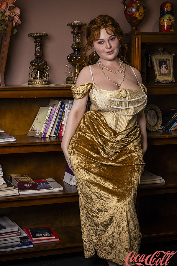 With her soft auburn curls, sparkling blue eyes, and that elegant, confident smile, Ivory looks like she stepped out of a classic romance novel or a high-society fantasy. Standing at 161cm tall with an impressive H-cup bust, she offers the perfect life size sex doll balance — easy to hold close, position comfortably, and enjoy in any intimate setting. Her plush, velvety gold gown clings beautifully to her voluptuous curves, highlighting her full hips, thick thighs, and incredibly soft, lifelike skin that feels warm and real with every touch.