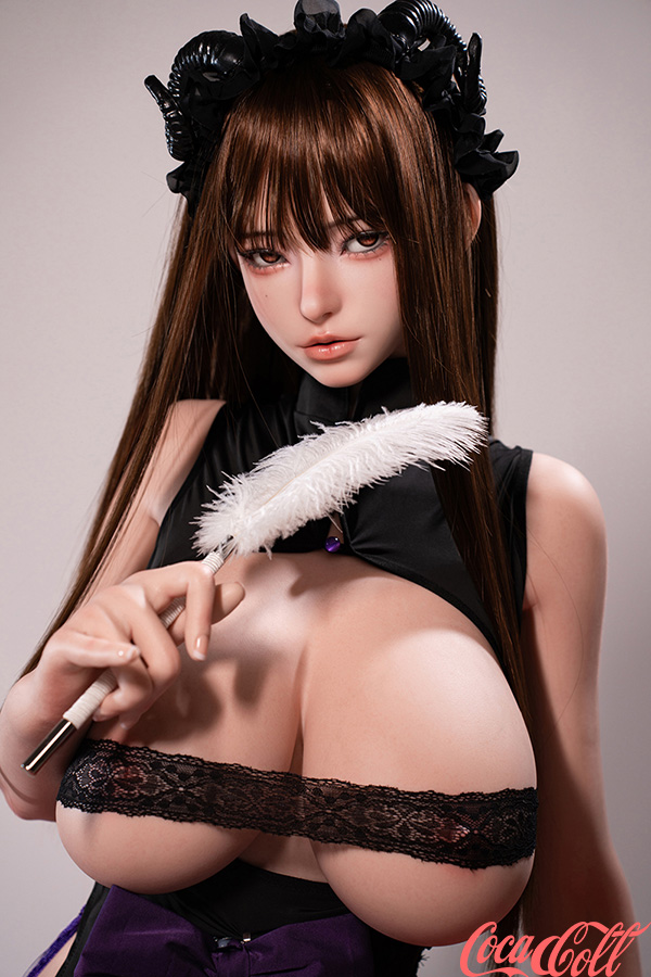 This is a plump and adorable little girl with a sweet face. Her dark brown long hair and eyes of the same color are big and bright. When the sex doll looks at you, you can't help but comply with any of her requests. The black headpiece with a light chiffon texture gives the impression of cuteness and innocence. However, if you accidentally believe what she says, you might get an unexpected result that you never expected. She holds a white feather in her hand, exuding purity. However, she was wearing a style that was completely different from the previous one - a revealing topless dress and black suspenders, along with black high heels. But this outfit on her didn't seem out of place; instead, it added a unique charm. The curvy sex doll was sitting on the red table beside you, with one hand resting on it, her eyes fixed on you as if she wanted you to come closer too, and then perhaps she would completely surrender herself to you.